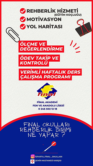 Öğrenci merkezli eğitim anlayışı ve deneyimiyle her öğrencisini erişebileceği en yüksek noktaya taşımayı hedefleyen Final Okulları lise kademesinde Anadolu ve Fen lisesi programları ile bireyin öğrenme sürecine etkin olarak katılımını sağlamayı amaçlayan aktif öğrenme modelini uygular. Öğrenciler pasif alıcı olmaktan çıkıp yaparak yaşayarak öğrenen boyutuna geçerler. Bu metotla karar verme, sorumluluk alma ve öğrenmeyi öğrenme olanağına kavuşurlar. Analiz, sentez ve değerlendirme gibi üst düzey becerilerle sürece dahil olurlar. Final Okullarında ezbercilik kavramının yerini merak, kuşku, deneyerek öğrenme, araştırma ve uygulamanın aldığı, yaşama ve karşılaşacağı sınavlara hazırlandığı bir eğitim sunulur. Final Okulları aynı zamanda sadece öğrencilerine özel oluşturulan FinalSmartZone platformu ile eğitimde sınırları ortadan kaldırıyor. Platform içindeki Flipped Classroom modülü sayesinde öğrencilerimiz kazanımlara yönelik konu anlatımlarını kendi belirledikleri zaman ve mekan çerçevesinde istedikleri kadar tekrar ederek izleyebiliyor ve böylece pekiştirme çalışmalarını okulda eğitmenleri ve akranları ile beraber etkileşim hâlinde gerçekleştirebiliyorlar. Bunun yanı sıra sınav başarısı kadar yaşam başarısı da öncelikli hedeflerimizden biridir. Bu doğrultuda yürüttüğümüz kulüp çalışmalarımızda kapsamlı spor ve sanat etkinlikleri ile öğrencilerimizin bedensel ve ruhsal gelişimi destekleniyor. Sanat ve müzik atölyelerinde yapılan çalışmalar, açık ve kapalı spor alanlarında yapılan faaliyetler ile öğrencilerimizin yetenek, ilgi ve ihtiyaçlarını keşfetmeleri ve kendilerini tanımaları sağlanıyor.